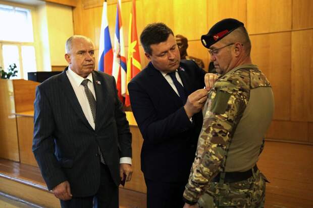 Председатель Думы городского округа города Калуги Юрий Моисеев и депутат Думы, военный комиссар Калуги Андрей Иванов вручили медаль «За храбрость» II степени участнику специальной военной операции Юрию Владимировичу Буднику. Он удостоен этой награды за мужество, отвагу и самоотверженность, проявленные при исполнении воинского долга.